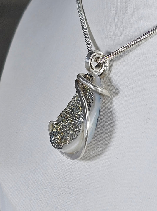 Agatized Drusy Handmade Crystal Pendant Wrapped in Silver