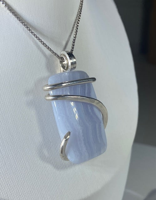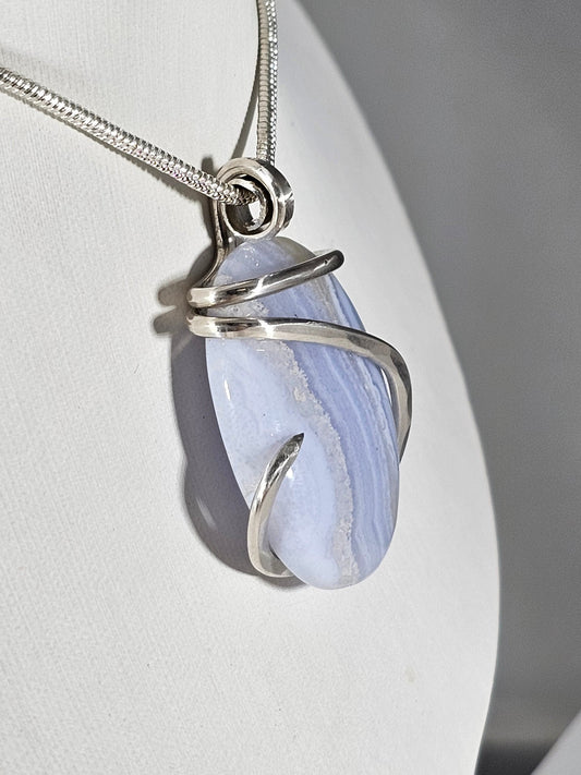 Blue Lace Agate Handmade Stone Pendant Wrapped in Silver