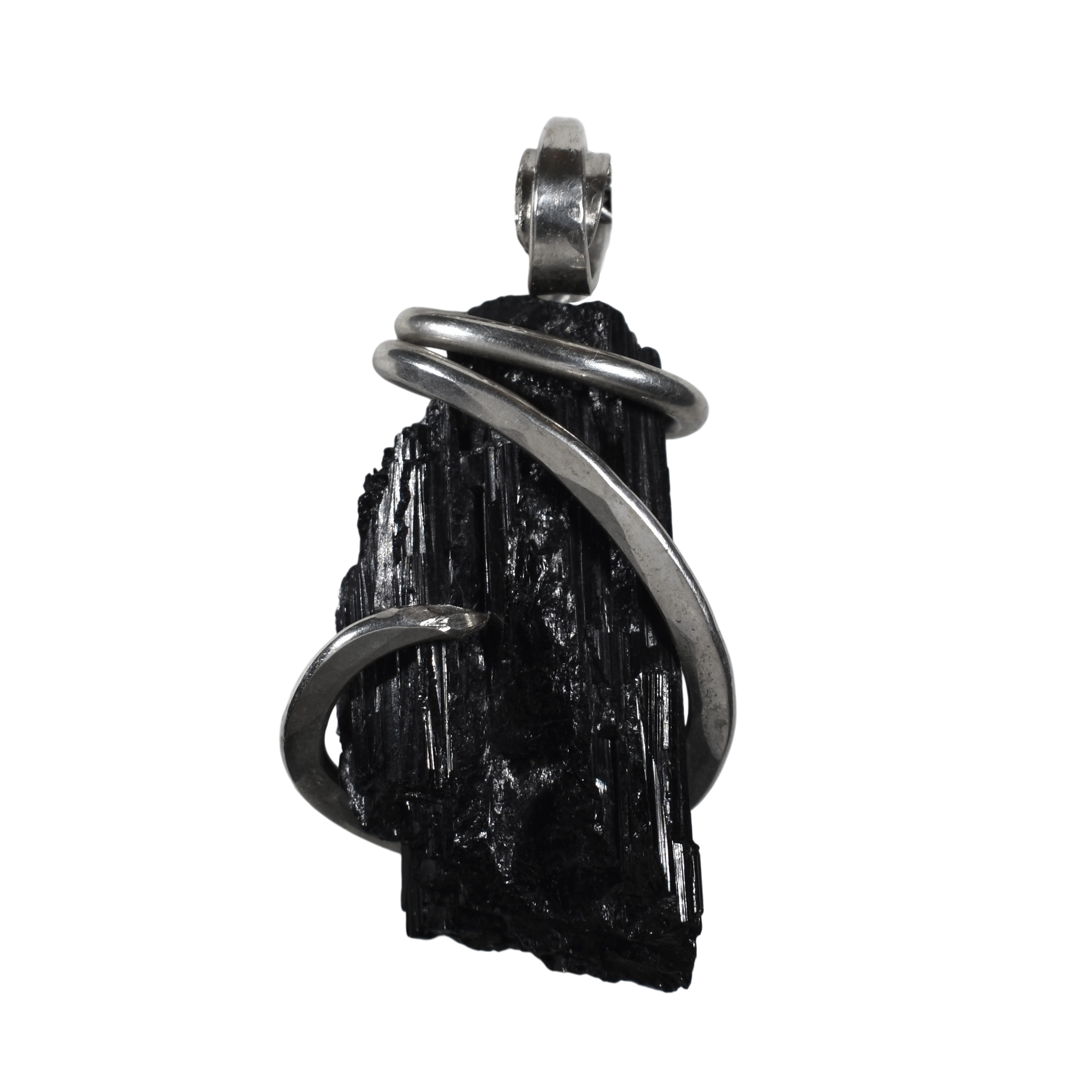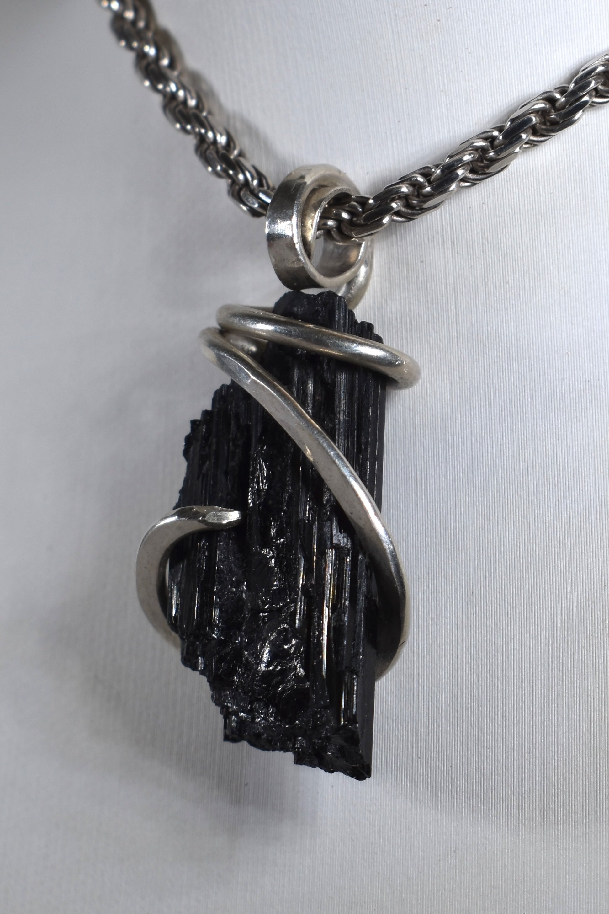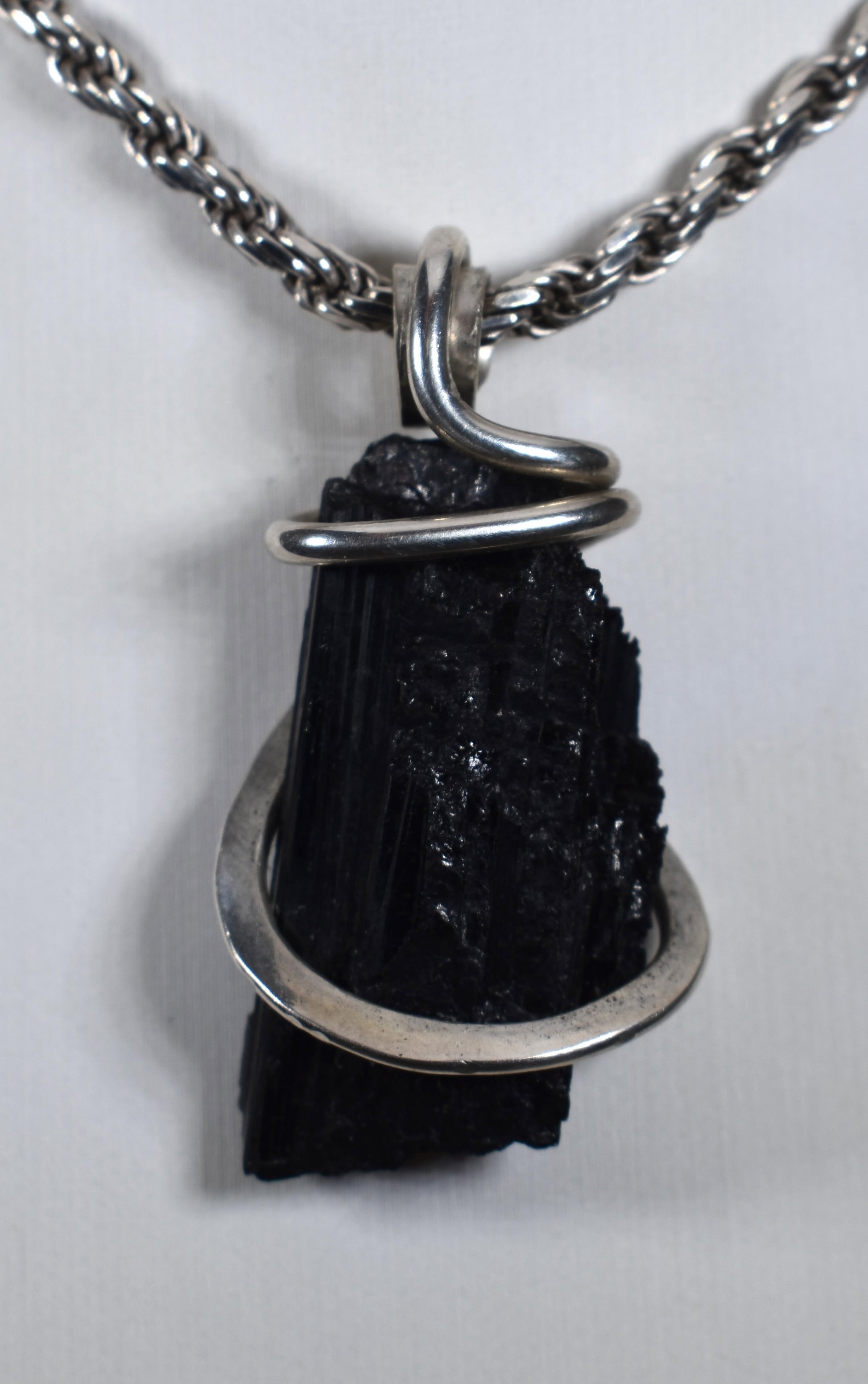 This pendant is made of Brazilian Black Tourmaline and hand-wrapped in 13-gauge sterling silver wire.