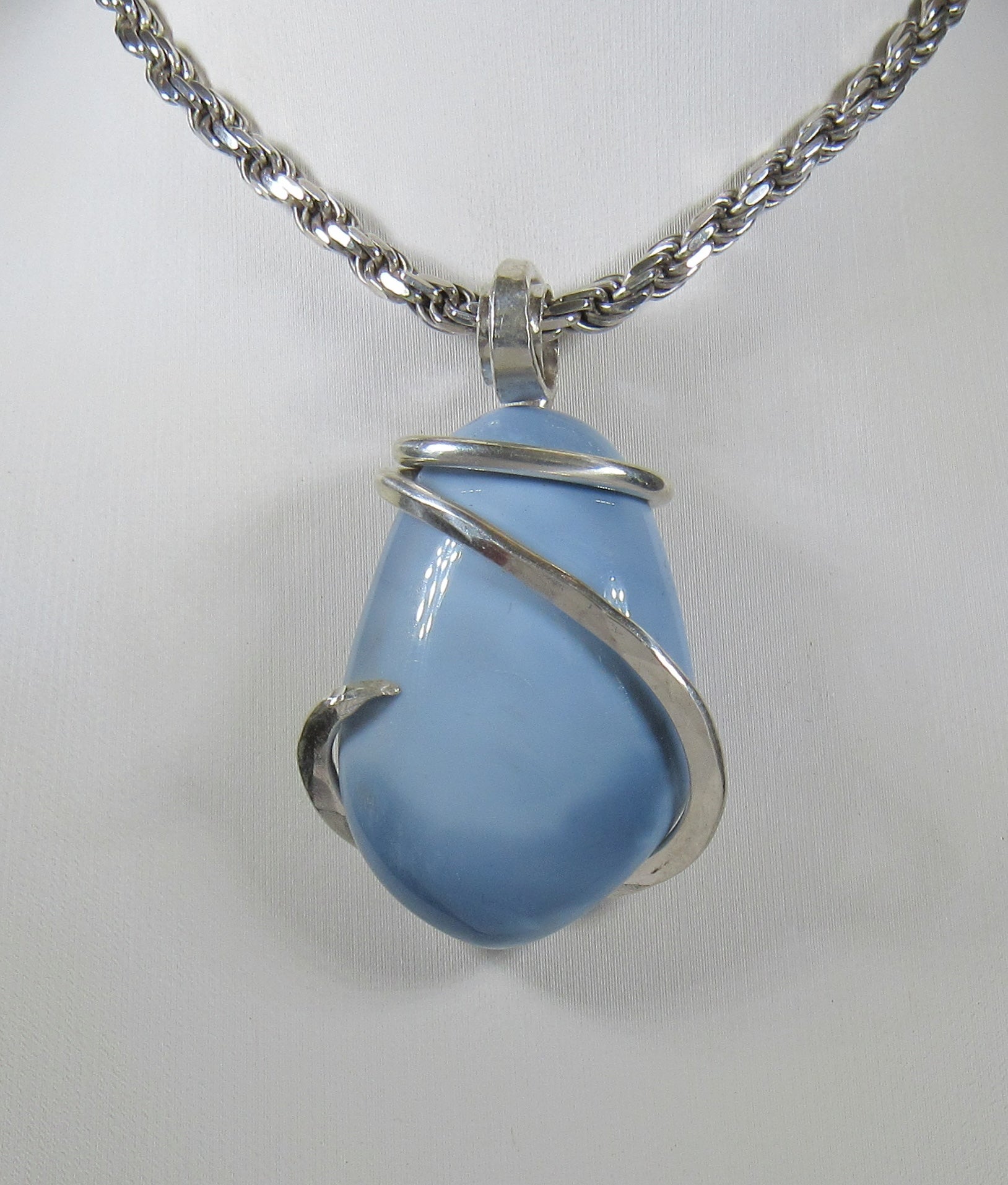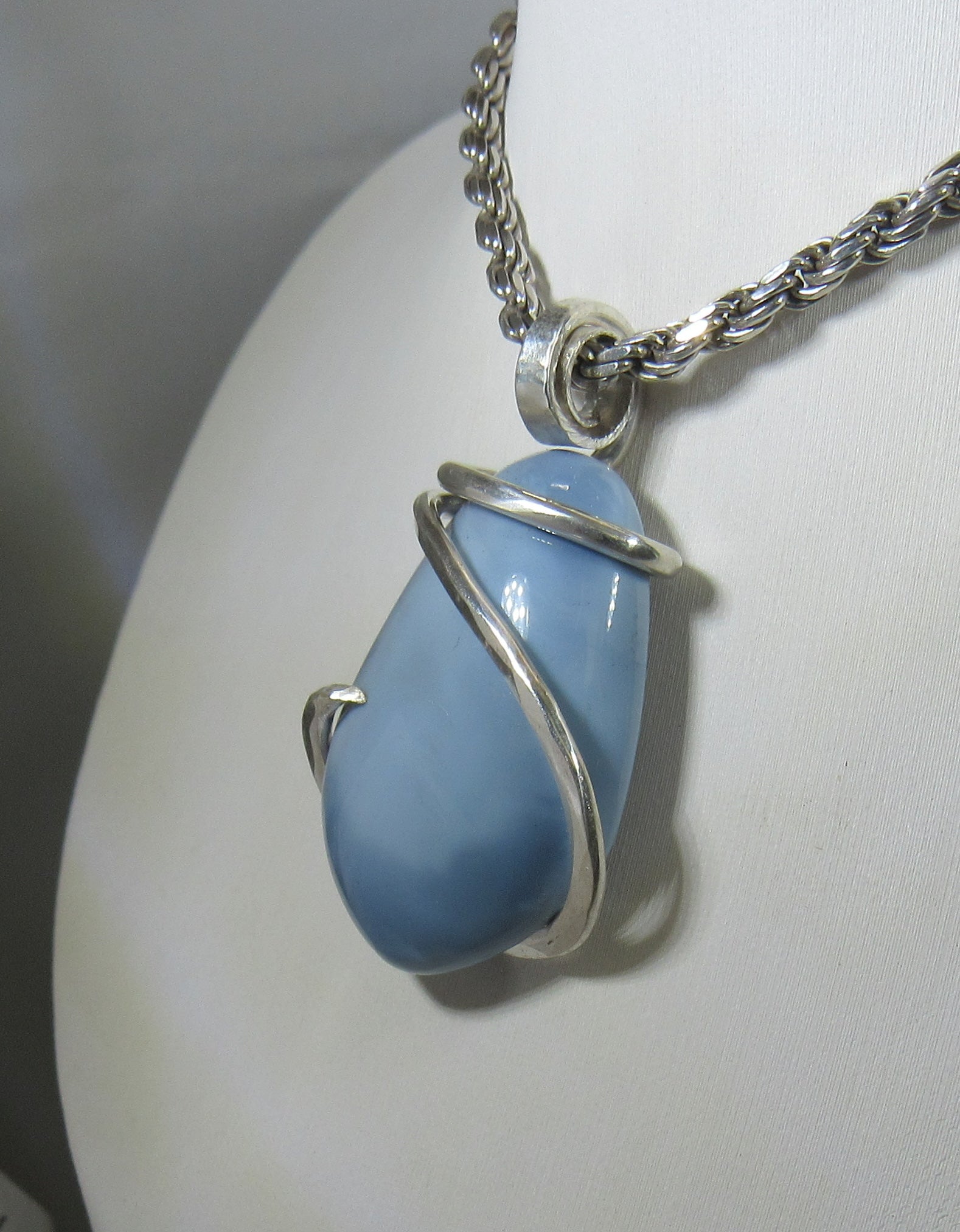 This pendant is made of Indian Blue Opal and hand-wrapped in 13 gauge sterling silver wire.