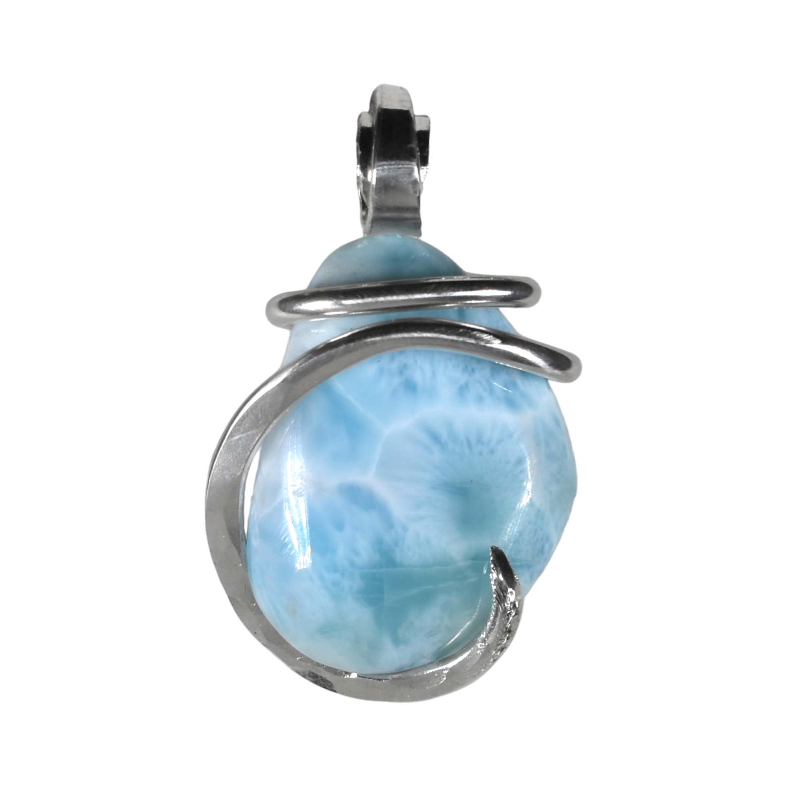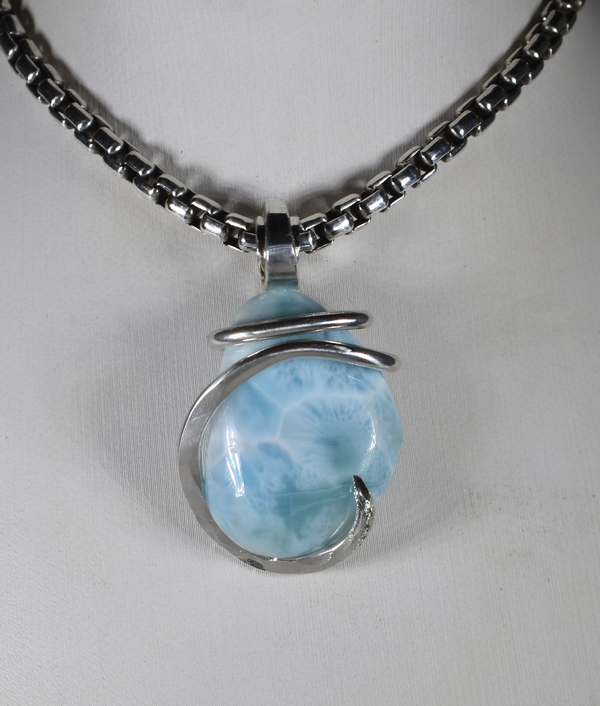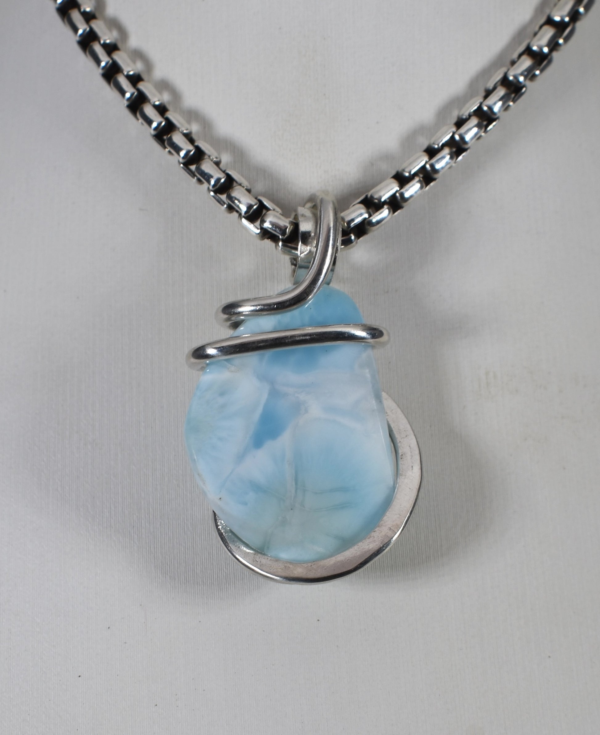 This pendant is made of Larimar and hand wrapped in 13 gauge 925 sterling silver wire.