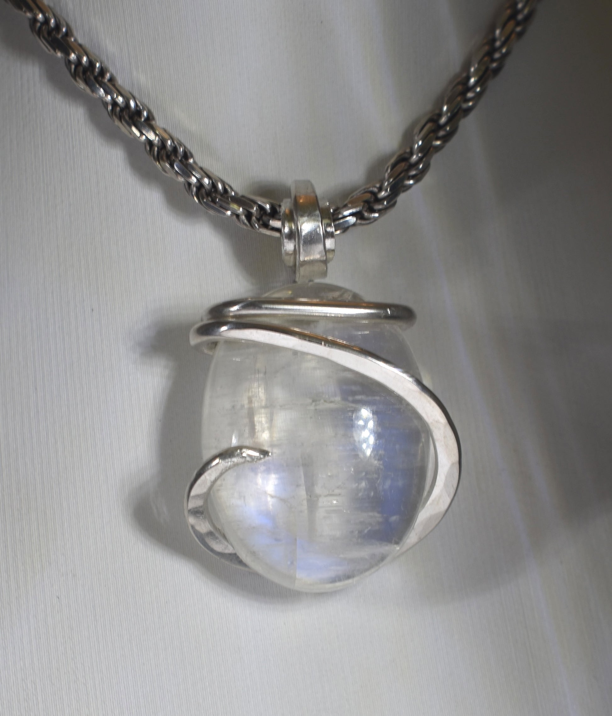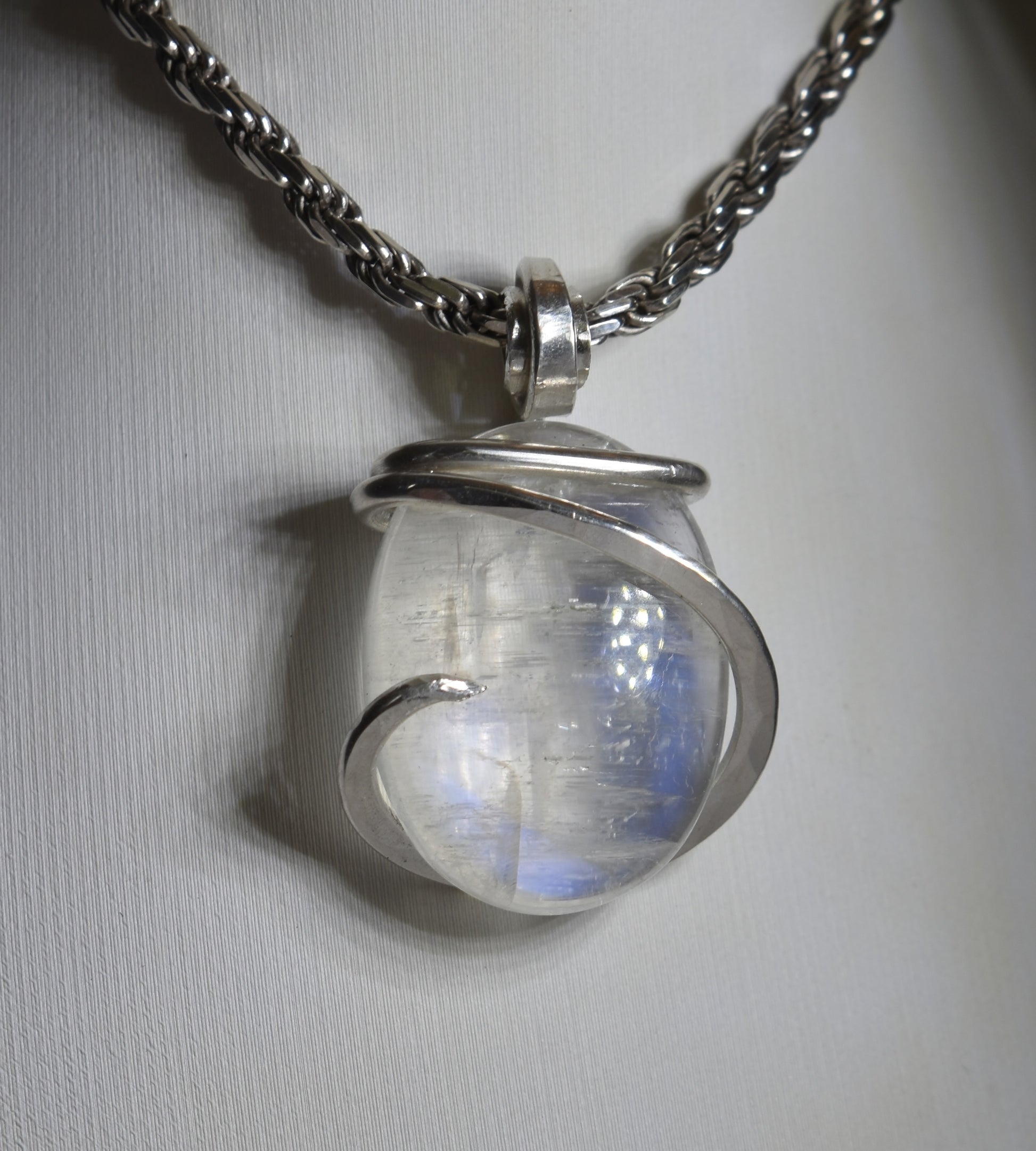 This pendant is made of Indian Moonstone and hand-wrapped in 13 gauge sterling silver wire.